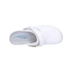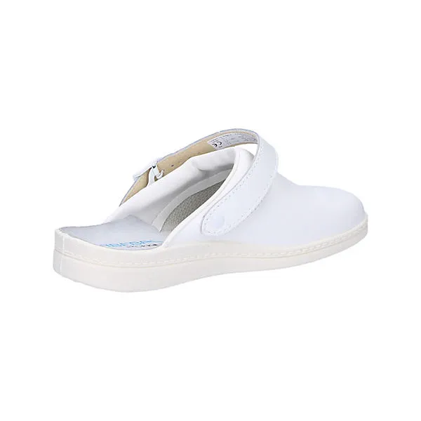 Sicherheitsklasse: EN ISO 20347:2012 OB FO SRC, Zehenschutz: ohne, Durchtrittschutz: ohne, Obermaterial: Glattleder, Farbe: weiß, Innenfutter: Leder, Sohle: rutschhemmende Laufsohle, Weite: 10, Extras: verstell- und klappbarer Fersenriemen, TÜV GS- geprüfte Sicherheit, Lederdecksohle, Sanitized behandelt, beständig gegen Kraftstoffe und tierische Fette