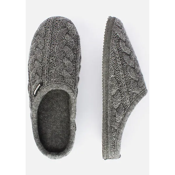 Warmer Winterpantoffel mit Zopf-Strickmuster – erhältlich in verschiedenen Farben. Modell „Neudau“ ist geeignet für unser Wechselfußbett oder zum Tragen von eigenen Einlagen. Die weiche Naturkautschuk-Sohle ist rutschfest, leicht, flexibel und verleiht ein Gefühl des Barfußgehens.