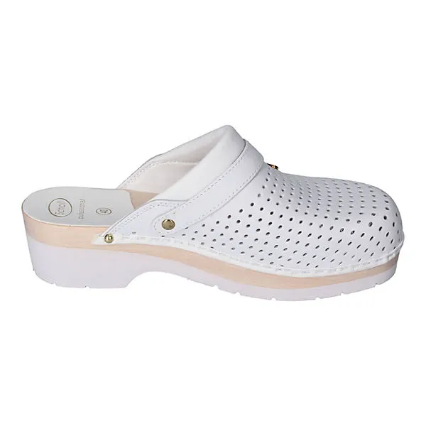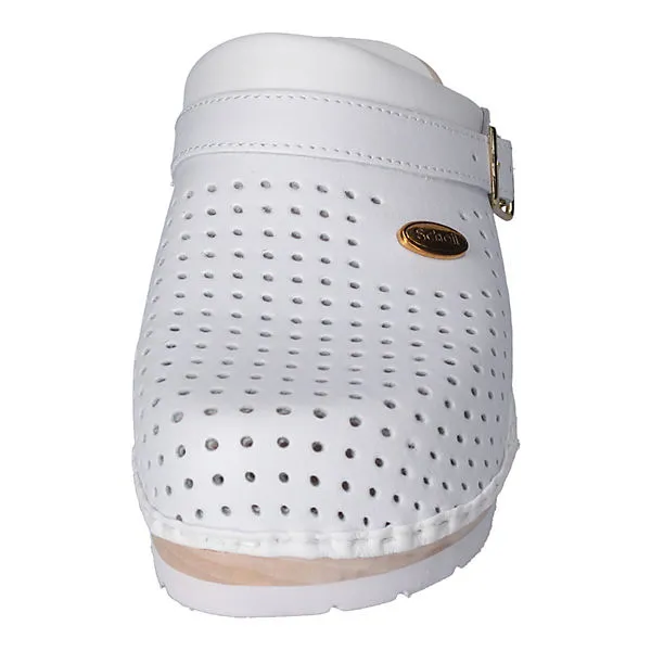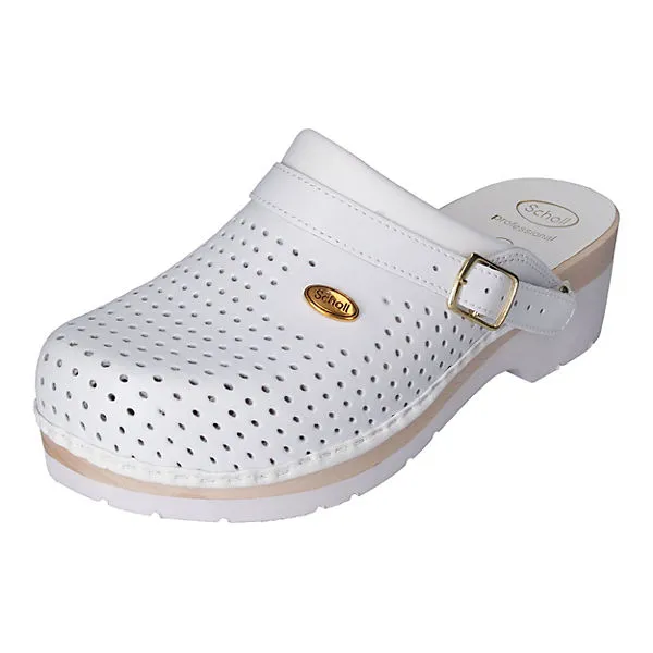Obermaterial auf perforiertem Glattleder für perfekte Atmungsaktivität Gepolsterter Rand Anatomisch geformtes Fußbett aus Buchenholz Die Außensohle ist rutschfest EN 347-1:1992 Arbeitschuhe nach EN 347-1:1992 Schutzklasse I Nickelfrei Vestellbarer Riemen Modell: Supercomfort Marke: Scholl