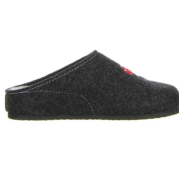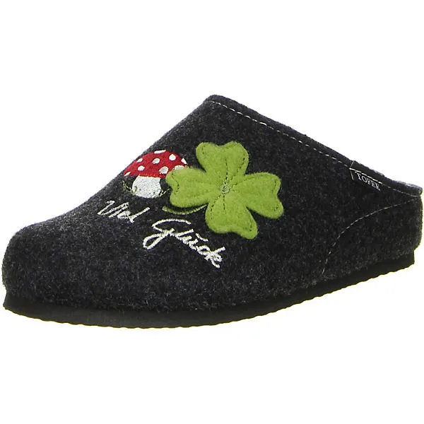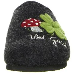 Das Obermaterial wurde aus Naturwollfilz gefertigt. Für ein äußerst angenehmes Tragegefühl sorgt das weiche Innenmaterial aus Filz. Das optische Highlight ist das gestickte Kleeblatt und der Pilz auf dem Blatt.