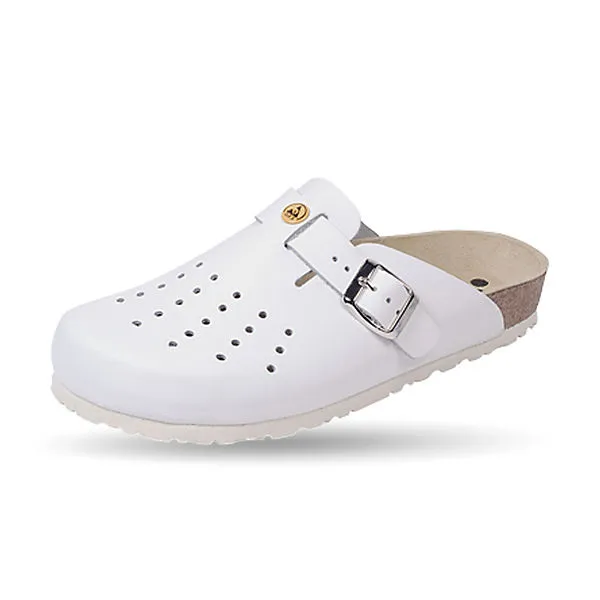 ESD-antistatik-Clog für Damen und Herren (gegen statische Aufladung nach ESD), Blattperforierung, rutschhemmende Spezialsohle, Naturkork-Luftpolsterfußbett mit leitfähigen Kontaktpunkten, Lederdecksohle, Obermaterial in pflegeleichtem Glattleder