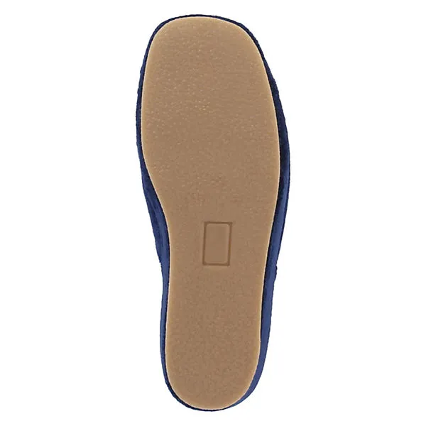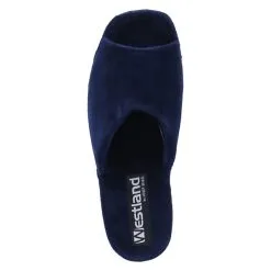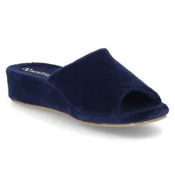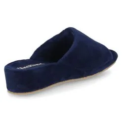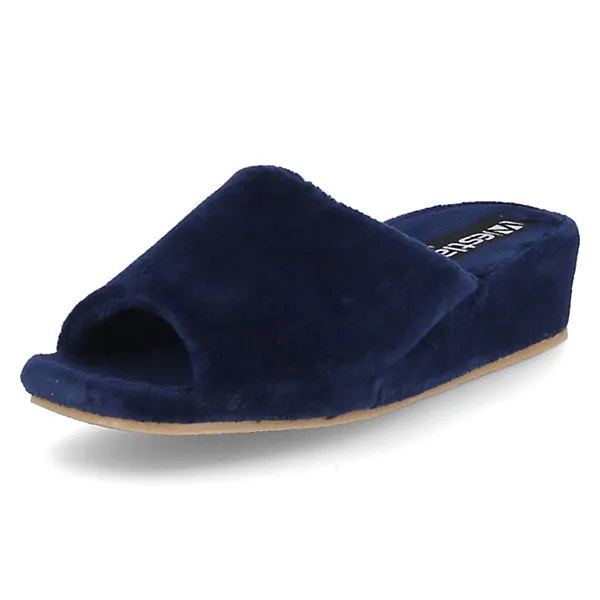 Die Marke Westland bietet Damen mit diesen blauen Open Toe-Pantoletten namens MARSEILLE weiche, flauschige Hausschuhe aus Textil, mit ca. 4 cm hohem Keilabsatz an.